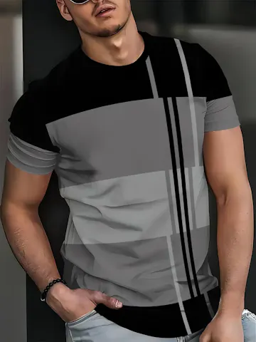 Striped Casual T-Shirt, Men's 3D Illusion Striped Casual T-Shirt- Black and Gray Block Design, Regular Fit Crew Neck, Machine Washable Digital Print Shirt, Soft Fabric.
